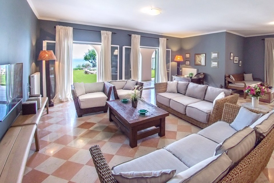 Lounge/dining room flat screen tv, dvd player, music system, comfortable seating, area with dining table and chairs, doors to terrace gardens, air conditioning cold heat, Internet access wi fi, sat tv