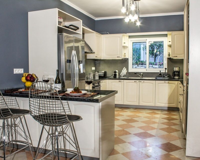 Villa Athina is a three-level building and consists of the ground floor, the first and the second floor. The ground floor has a play room with pool table, a table for cards, TV and a desk. There is also a fully equipped kitchen (oven – ceramic hearth – dishwasher – refrigerator – microwave) and laundry room. There is also two bedrooms with independent bathrooms and dressing room, and a WC.